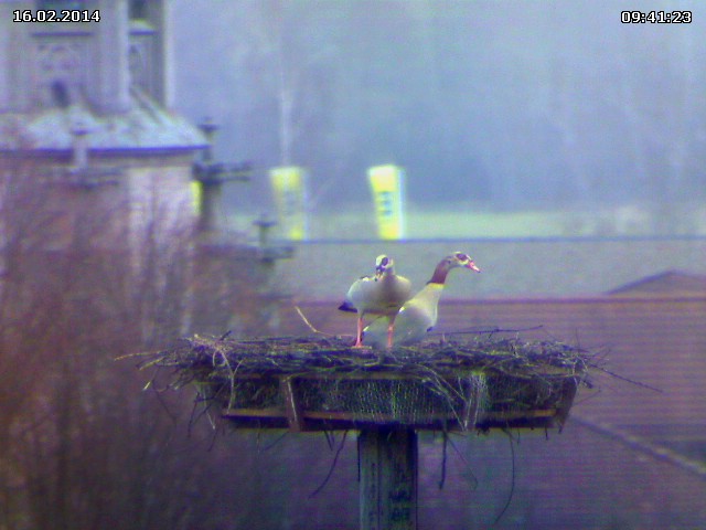 Wie schon im letzten Jahr, haben auch heute morgen zwei Nilgänse das Nest auf dem Mönchsturm erkundet. Auch sie sind fast einen Monat früher dran als 2013. Hoffentlich entscheiden sie sich gegen dieses Nest. Nilgänse gelten als sehr aggressiv und versuchen häufig hoch liegende Nester für sich zu gewinnen.