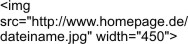 Der Text wird am Stück geschrieben. Ein Leerzeichen ist nur nach dem Wörtchen img und vor dem Wörtchen width. Natürlich muss der Text http://www.homepage.de/dateiname.jpg mit eurer Zieladress ersetzt werden. Das width="450" wird nur gebraucht, wenn euer Bild größer als 450 Pixel breit ist.