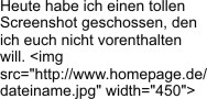 Der Text wird am Stück geschrieben. Ein Leerzeichen ist nur nach dem Wörtchen img und vor dem Wörtchen width. Natürlich muss der Text http://www.homepage.de/dateiname.jpg mit eurer Zieladress ersetzt werden. Das width="450" wird nur gebraucht, wenn euer Bild größer als 450 Pixel breit ist.