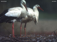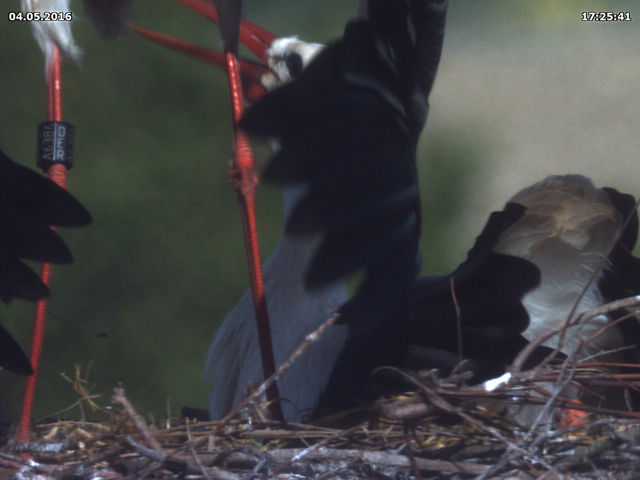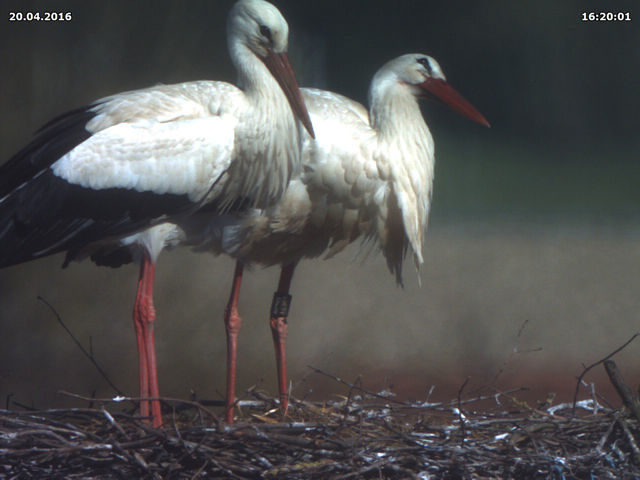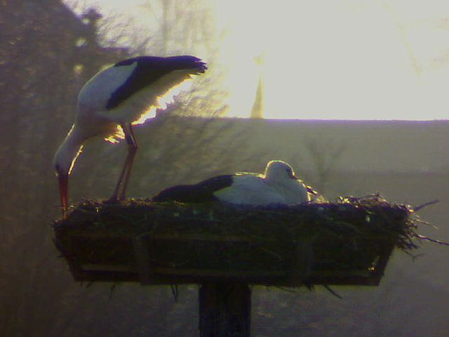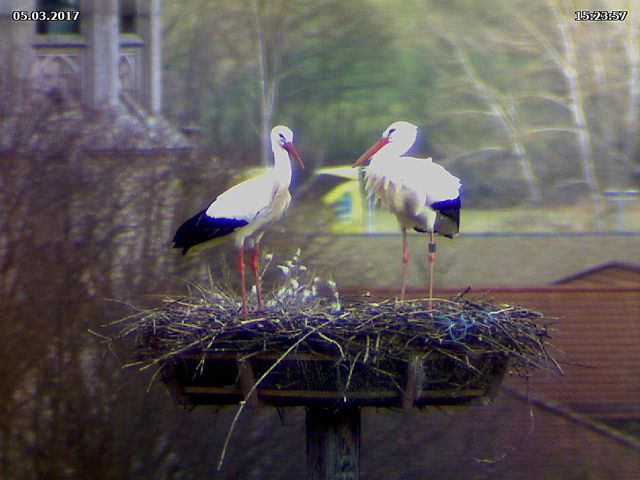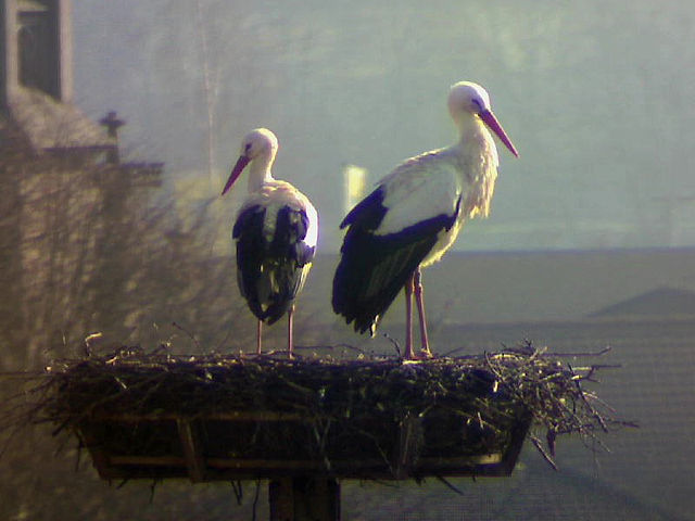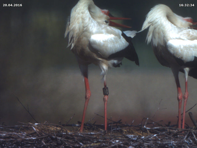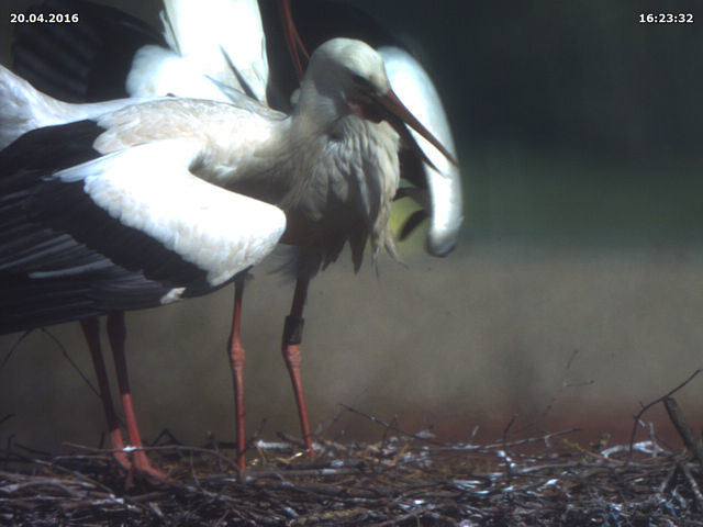 Bäumchen wechsel Dich! Während ich Donnerstag Spätnachmittag die Webcam wieder neu ausrichtete, waren gerade beide Störche im Nest. Nichts Außergewöhnliches. Das Weibchen etwas kleiner als das Männchen, der Schnabel etwas kürzer als der andere. Das Weibchen unberingt, das Männchen mit Ring am linken Bein. Ich stellte kurzzeitig die Auflösung des Chips höher, überflog die Nummer auf dem Ring - und wollte meinen Augen nicht trauen: DEH H5359. Die beiden Störche, die wir seit ihrer Ankunft vor einer Woche ganz selbstverständlich für Jakob und Adele halten sind nicht Jakob und Adele!
