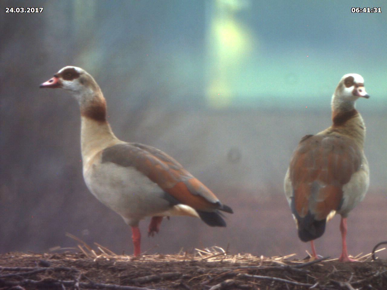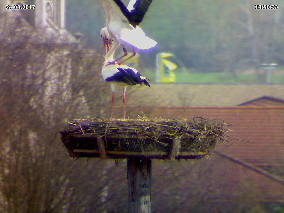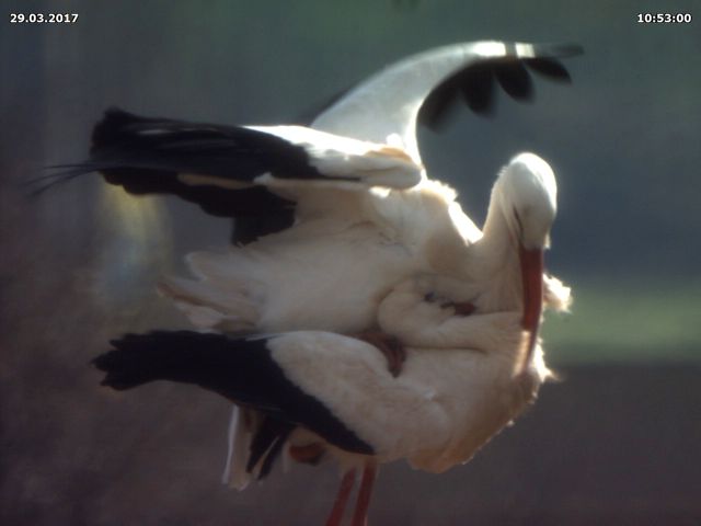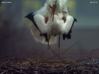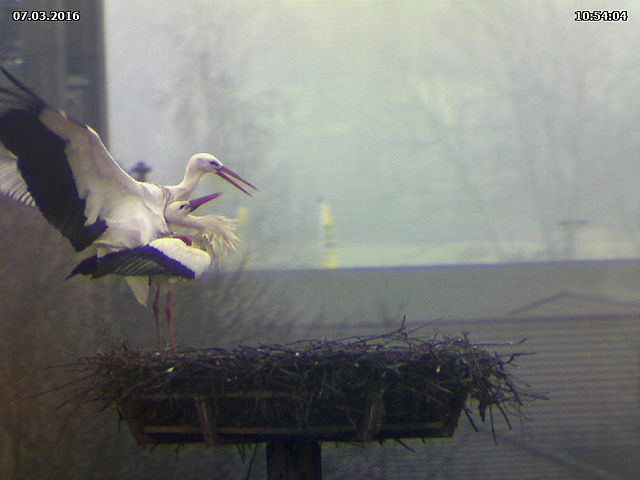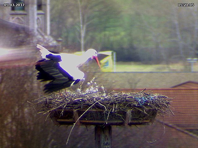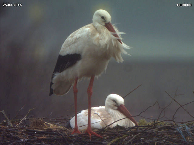 Aber auch von Jakob und Adele gibt es Neuigkeiten. Wenn ich sie heute richtig beobachtet habe, dann haben sie zu keiner Zeit das Nest alleine gelassen. Dies dürfte ein Hinweis auf Eier im Nest sein. Hin und wieder kann man sie auch im Nest stochern sehen, was ebenfalls als Hinweis gewertet werden kann. Damit lägen sie inetwa zeitlich gleich wie in den vergangenen beiden Jahren. 2015 haben sie ihr Nest ab dem 20.03. nicht mehr alleine gelassen. Allerdings hatten sie da auch nicht ganz so trübes Wetter wie in diesem Jahr.