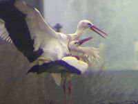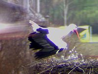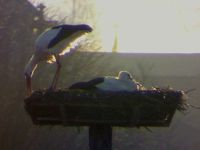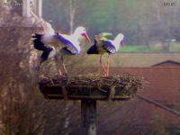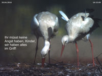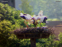 Ganz so friedlich wie bei meinem Aprilscherz lief der Besuch dann aber doch nicht ab. Jakob und Adele reagierten heftig. Der "Jungstorch" hat unmittelbarer vor deren Ankunft im Nest die Flucht ergriffen, so dass es zu keiner körperlichen Auseinandersetzung kam.