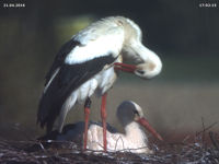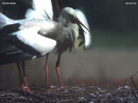 Es ist sehr schwer die Situation zu bewerten. Wir können uns einfach nicht in die Vögel hineinversetzen. Aber wir können beobachten, dass Bewegung ins Spiel kommt. Um 17:54 fliegt Adele das Nest an. Jakob steht umgehend auf. Ob seine Haltung in Storchensprache Ablehnung bedeutet wird nicht klar. In jedem Fall verhält er sich nicht so wie sonst, aber auch nicht so, wie wenn fremde Störche das Nest anfliegen. Er beobachtet Adele bei ihrem Rundflug dann sehr genau, verläßt dann zwei Minuten später selbst für etwa zehn Sekunden das Nest, ehe er sich wieder auf das Küken setzt. Sein Verhalten ist wie vor zwei Jahren. Ich vermute, dass es bei Adeles Rückkunft wieder zu einer heftigen Attacke kommt. Das Küken lebt glücklicherweise immernoch.