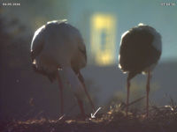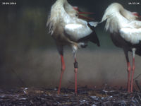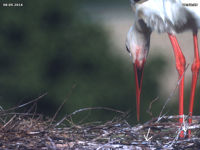 Um 12:13 Uhr treffen Jakob und Adele dann zum ersten mal seit Tagen aufeinander. Und fast möchte man meinen, dass es keine Auseinandersetzung zwischen ihnen gäbe. Aber ganz so dürfte es nicht sein, denn man muss diesen Vorgang sehr genau beobachten. Noch vor Jakobs Ankunft klappert Adele im Sitzen, dann scheint sie mit ihrer Körperhaltung ein Signal an Jakob zu senden, erst dann landet er im Nest. Sie begrüßen sich scheinbar mit normalem Geklappern, dann aber wirft sich Adele wieder auf den Boden. Ihre "devote" Haltung ist dabei nicht ganz so ausgeprägt wie vor zwei Jahren. Trotzdem meint man, dass sie einen von Jakobs "Ausrastern" erwartet. Jakob packt sie aber nicht. Der restliche Tag verläuft, als wäre nichts geschehen.