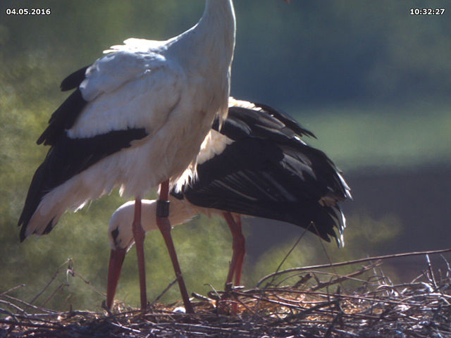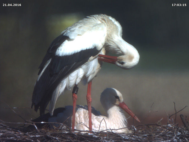 Heute war es wieder im friedlich im Nest. Jakob und Adele dürften sich noch fast zwei Wochen lang mit dem Brüten abwechseln, dann dürften die ersten Küken schlüpfen. Wenn man von ihrem Verhalten im letzten Jahr auf dieses Jahr schließen kann, dann dürften die Küken um den 04. Mai schlüpfen. Diese Angabe ist natürlich ohne Gewähr.