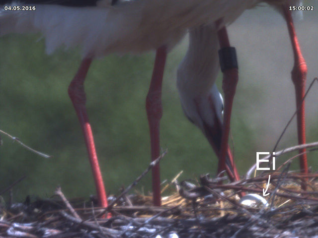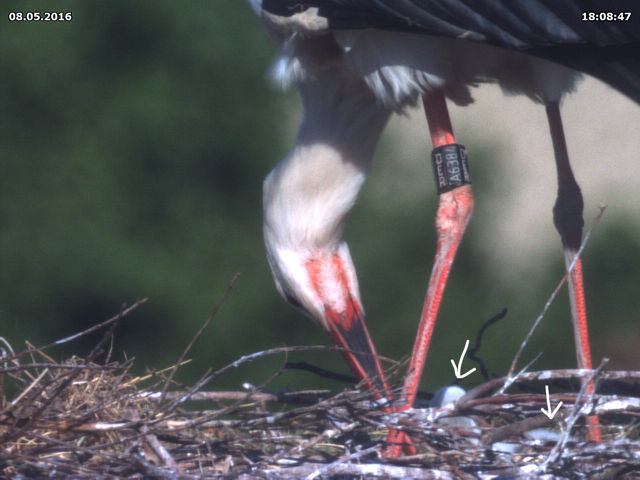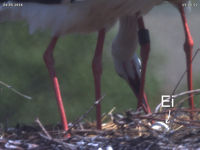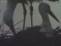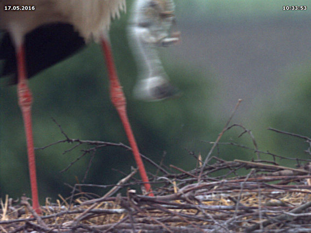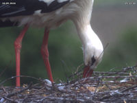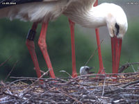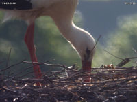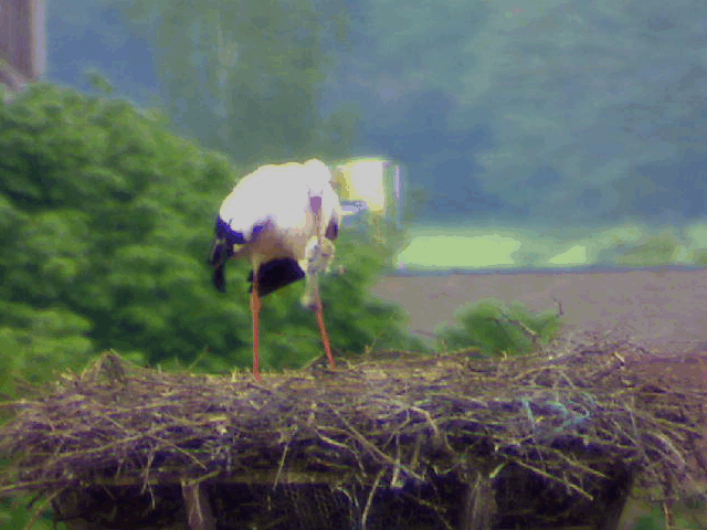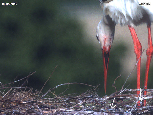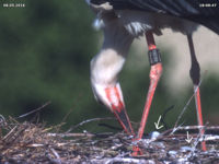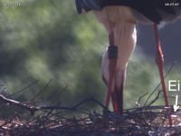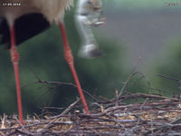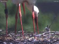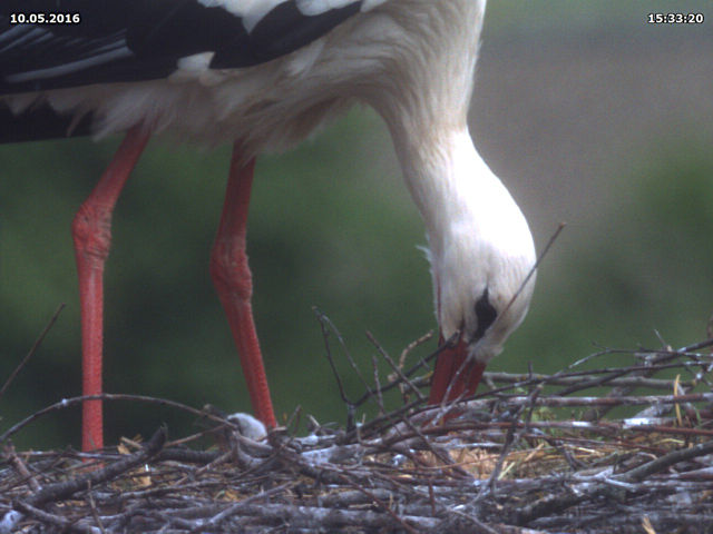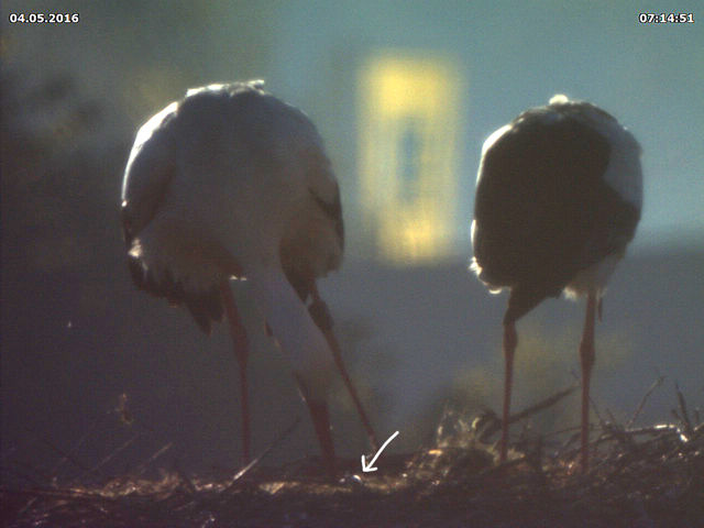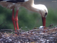 Bis zum späten Abend konnte ich keinen Beweis für ein zweites Küken finden. Allerdings zeigen Jakob und Adele ein Verhalten beim Füttern, welches dies dennoch vermuten lässt. Dies untermauert auch eine Aufnahme um 15 Uhr. Dabei befördert Jakob eine Eierschale an den Rand des Nestes. Zuvor stehen beide Storche sehr lange und scheinen "Geburtshilfe" zu leisten. Es könnte sein, dass an dieser Stelle ein zweites Küken geschlüpft ist, das der Kamera bis zum späten Abend verborgen blieb.