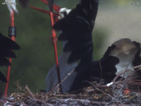 Am 13. Mai um 11:53 Uhr verließ Adele dann ohne Auffälligkeiten das Nest und kam bis zum jetzigen Zeitpunkt nicht mehr zurück. Sie umkreiste das Nest, hielt sich stets in der Nachbarschaft auf, kam aber nicht mehr zu den Jungen zurück. Zuletzt näherte sie sich auffällig und saß oft direkt unterhalb des Nests. Einige Aufnahmen von Sebastian Vogler zeigen eine leichte Abwehrhaltung Jakobs, die wir so aber nicht deuten können und auch nicht kennen. Wir konnten das seltsame Verhalten von Adele bereits vor zwei Jahren schon einmal so beobachten. Was es auslöst ist uns bis heute unbekannt geblieben. Diese Umstände jedenfalls "zwangen" Jakob gewissermaßen im Nest zu bleiben und das Küken warm zu halten. Wie lange genau sein Nahrungsvorrat reichte können wir nicht zweifelsfrei sagen. Versuche, Jakob Nahrung so nah wie möglich ans Nest zu bringen, wurden von ihm ignoriert, er holte sich nichts ab.