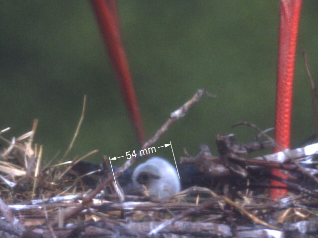 Was für ein herrlicher Tag! Der Sommer ist angekommen. Jakob und Adele machen es derweil spannend. Noch immer gibt es keinen eindeutigen Beweis für ein zweites Küken. Und noch immer scheint es aber so, als gäbe es noch ein zweites. Das sichtbare Küken jedenfalls wächst schon ganz ordentlich. Von Schnabelspitze bis Hinterkopf misst es heute 54mm.