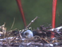 Es bleibt dabei. Auch die Auswertung der heutigen Bilder ergibt nichts anderes. Im Nest befindet sich ein Küken, das definitiv nicht das Küken vom 4. Mai ist. Auch heute konnte ich es vermessen. Es wächst orgendlich, was man auch mit durch Beobachten schon erkennen kann. Von Schnabelspitze bis Hinterkopf misst es 61 mm.