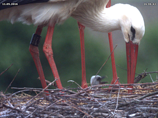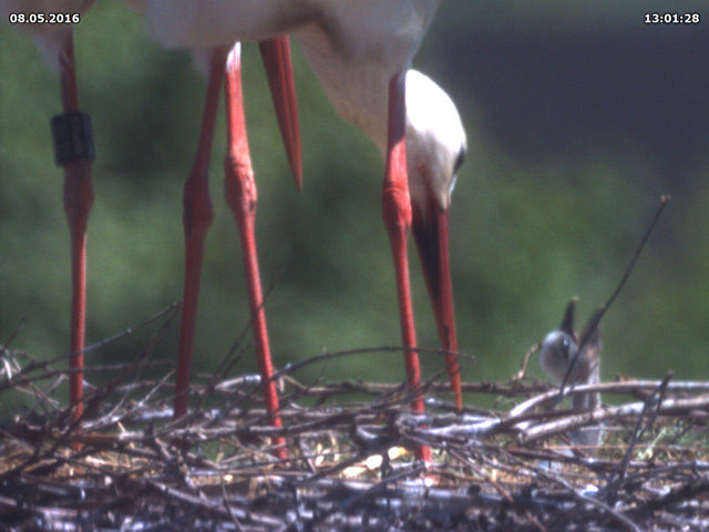 Die Brut verlief in diesem Jahr ohnehin nicht wie gewohnt. Am 04. Mai schlüpfte zunächst ein einzelnes Küken, das von beiden Eltern gut versorgt wurde und auch heranwuchs. Trotzdem dürfte es in den Morgenstunden seines fünften Lebenstags verstorben sein, während beinahe zeitgleich (9. Mai 10 Uhr) ein zweites Küken das Licht der Welt erblickte. Dieses zweite Küken wurde zunächst auch von beiden Eltern versorgt.