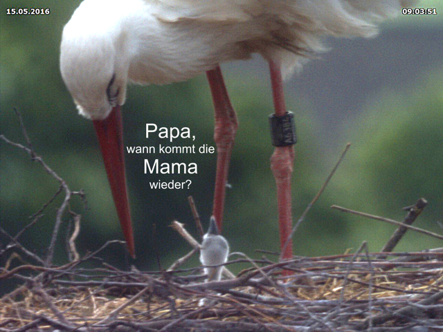Sie erinnern sich sicher noch an Jakobs Attacken Adele gegenüber. Ich habe das nochmals nachgelesen, weil ich mir nicht mehr sicher war, ob Adele wegen den Attacken abgehauen war oder Jakob wegen Adeles "Ausflug" diesen Ausraster bekam. Auch 2014 war erst Adele nicht mehr ins Nest gekommen, dann kam Jakobs "Rache". Wir werden uns wohl an die Macken dieser Storchenehe gewöhnen müssen.