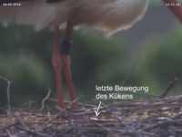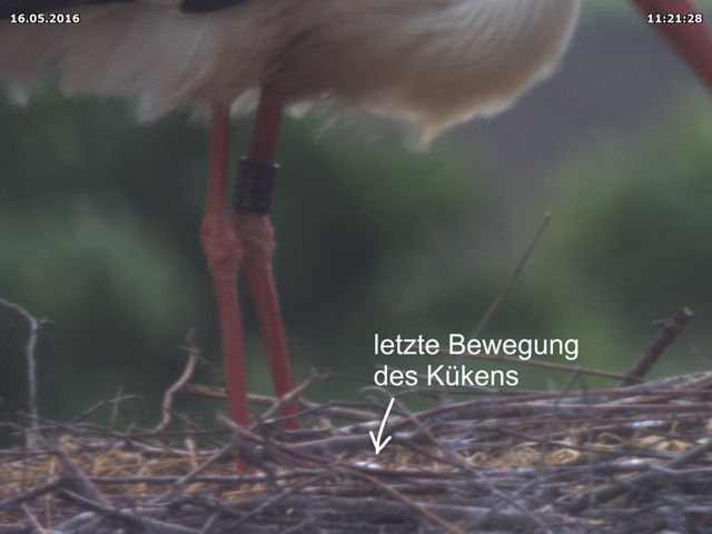 Ich habe keine Hoffnung mehr. Den ganzen Nachmittag über gab es im Nest kein Lebenszeichen von einem Küken mehr. Im Moment laden die Bilder noch herunter. Aber ich vermute, dass ich nach Auswertung aller Aufnahmen kein schöneres Ergebnis mitteilen kann. Vermutlich ist das Küken zwischen 8:30 Uhr zu 12 Uhr gestorben.