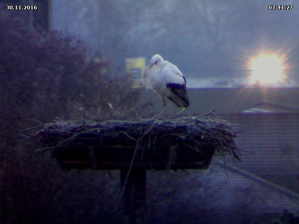 Bei minus 8 Grad in Hammelburg zieht es wohl auch die Störche wieder in ihr Nest zurück. Wärmer wird es da allerdings nicht sein. Noch weiß ich nicht, ob Jakob oder Adele im Nest steht. In jedem Fall ist mindestens ein Storch zurück.