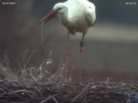 Es tut sich was! In den letzten beiden Tagen konnte man Jakob und Adele viel häufiger als sonst im Nest beobachten. Immer wieder kann man sie auch kurz beim Nestbau beobachten. Auf erste Eier werden wir aber vermutlich noch warten müssen. Im letzten Jahr begannen die beiden erst Ende März mit dem Brüten.