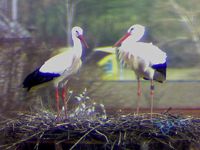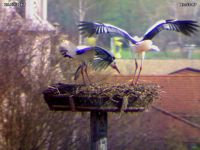Jakob und Adele sind wieder "wieder da"! Nachdem heute Mittag bereits die Störche hoch über Hammelburg gekreist waren, landete Adele zunächst um 15:20 Uhr im Nest, unmittelbar gefolgt von Jakob. Der neuerliche Besuch gestaltete sich wieder recht kurz: nach zehn Minuten haben sie das Nest wieder verlassen. Wenigsten begrüßten sie sich dabei ordentlich und schienen auch einige Abwehrhaltungen zu zeigen, als würden sie Anspruch auf das Nest erheben.