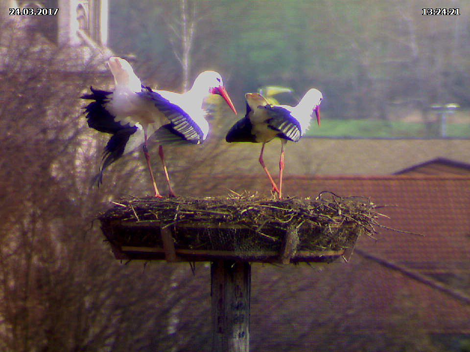 Um 13:24 Uhr sind dann Jakob und Adele zum dritten Mal in diesem Jahr im Nest erschienen. Die Bilder nach der Landung verraten recht deutlich, dass sie das eher aus einer Notwendigkeit heraus getan haben. Sie begannen ihren neuerlichen Besuch nämlich sofort mit der Verteidiung des Nestes.