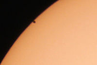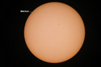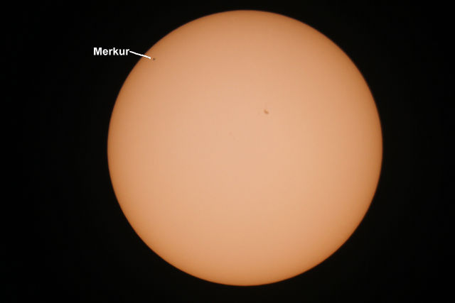 Gerade in diesen Stunden wandert der Merkur vor unserer Sonne vorbei. Dabei ist der Merkur nur als sehr kleiner Punkt wahrzunehmen. Obwohl er näher an der Erde ist als die Sonne ist er trotzdem viel viel kleiner. Bitte nicht direkt in die Sonne schauen.